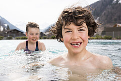 Ein Kind und ein Mann in einer Berggewässer mit Neopren und Canyoning Ausrüstung. ©  CC BY-NC-ND 4.0 unbekannt / Alpinzentrum Gstaad